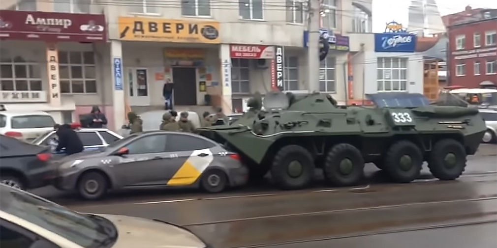 Курьезное ДТП случилось в феврале этого года в центре Курска. Боевые машины следовали колонной для передислокации в одну из воинских частей. В какой-то момент БТР остановился и начал сдавать назад, собрав за собой сразу четыре легковушки, вклинившиеся в колонну военной техники. Гражданские автомобили оказались зажаты между двумя броневиками. Пострадавших в этом инциденте не было. Видео с регистратора Volkswagen Touareg сразу собрало кучу просмотров в сети. Вот оно: